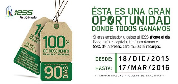 Si eres empleador y debes al IESS. “Ponte al día” Paga todo el capital y te descontamos el 99% de intereses, cero multas y recargos. Desde: 18 – Dic – 2015 Hasta: 17 – Mar – 2016